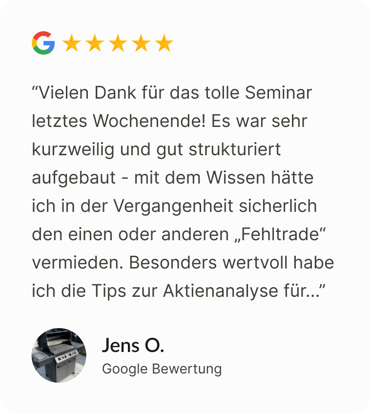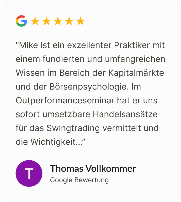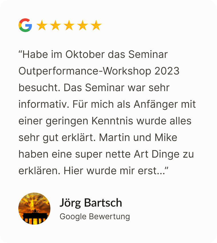 Seit dem Start des Coachings konnte ich über 13% Rendite erwirtschaften. Meine Performance ist besser geworden. Börsenhandel ist jetzt kein Hobby mehr was Geld kostet sondern etwas, das Geld bringt.“